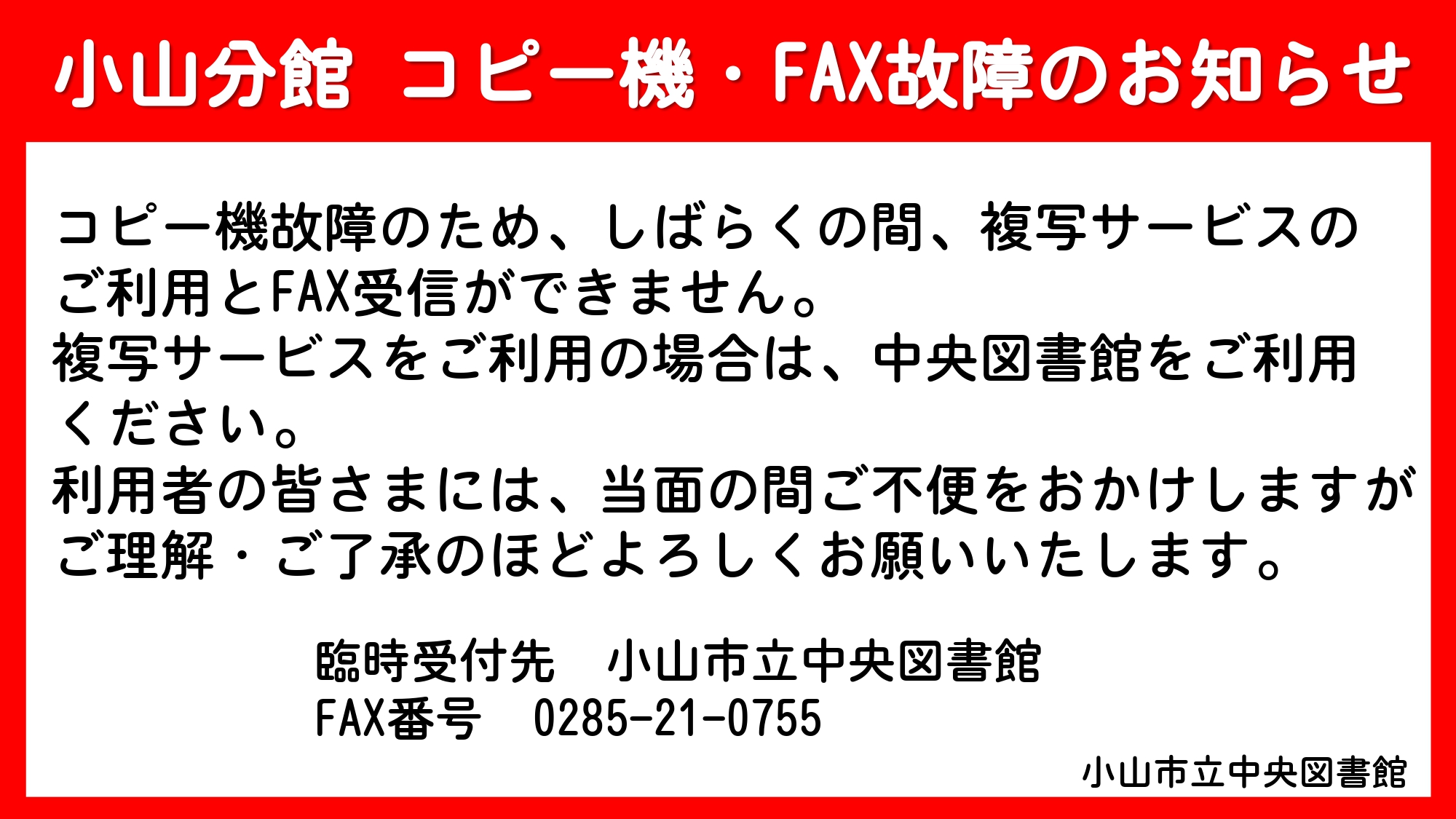 【復旧しました】小山分館 コピー機・FAX故障のお知らせ